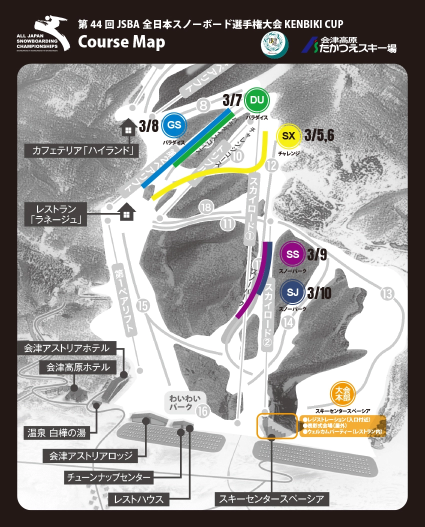 | □注意事項 | ○全ての競技者にスキー・スノーボード用ヘルメットの着用、及び「流れ止め」の装着が義務付けられています。 ○「2025年度 日本スノーボード協会 公式用品」以外での出場は認められません。 使用用具を 公式用品リスト でご確認ください。 ○指定の駐車場をご利用下さい。駐車場以外へは、駐車しないで下さい。路上駐車は事故発生の原因となりますので絶対にお辞めください。 ○除雪のため車の移動をお願いする可能性がございます。夜間は駐車禁止です。除雪の妨げになりますので夜間駐車は固くお断りします。 ○競技の遅延を防ぐため、スタート審判のスタートコール後はアプローチで止まることなく速やかに試技を行うようご協力をお願いします。 ○規制エリア内は、選手と公認コーチのみになります。公認コーチは申請が必要ですので事前に大会本部( スキーセンタースペーシア 内)にてお手続きください。 また、FS種目(HP/SS/SJ/QP/JB)では、U-12以下の年齢カテゴリー該当者の保護者1名は、大会本部に申請をし、許可を得ることでスタート地域への立ち入りが認められます。 【保護者=免責同意書に署名された本人】 ※お申込みの際に本人確認を行いますので、身分証明書(運転免許証やマイナンバーカードなど)をご持参ください。 ○コースコンディション維持のため硫安をまく可能性があります。 ○コース外および滑走禁止エリアへの立ち入り・滑走は絶対におやめください。 ○スキー場にワックスエリアはありませんのでご注意ください。 ○駐車場を含むすべてのスキー場施設でワックス等のゴミを出さないようお願いいたします。ゴミは必ず持ち帰るようお願いいたします。 ○【重要】リフト降り場からパークへの移動など事故などないようにお願い致します。 |