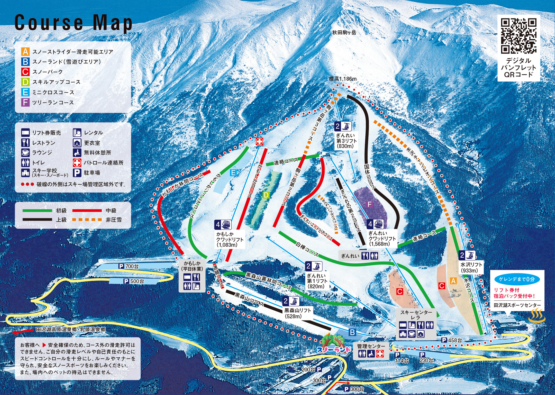 競技会場 COURSE 競技会場 〒014-1201 秋田県仙北市田沢湖水沢温泉郷TEL:0187-46-2011 (代表) 競技バーン 国体コース下部 大会本部 スキーセンターレラ1階TEL:090-5444-9094 ノーティスボード ・スキーセンターレラ入口・公式LINEアカウント 選手受付(ビブ配付) スキーセンターレラ1階 大会本部 閉会式・表彰式 管理センター1階「無料休憩所」
